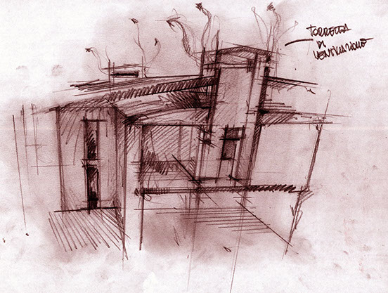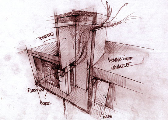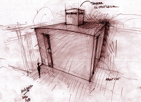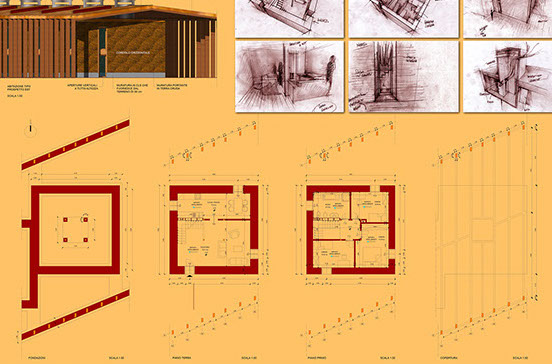 ABITARE LA TERRA CRUDA La proposta progettuale di questo edificio è nata con l’obiettivo principale dell’ecosostenibilità, attraverso l’introduzione di dispositivi bioclimatici attivi e passivi e l’uso di materiali sani . L'edificio di progetto è stato adattato, così, alle caratteristiche dell'ambiente circostante per ottenere il maggior vantaggio dal punto di vista termico e luminoso, sfruttando lo stesso "intorno" per migliorare le proprie condizioni di comfort. Dal controllo dell’impatto sole-aria sull’edificio, sono scaturiti, tenendo conto dei vincoli, l’orientamento, la forma, la distribuzione degli ambienti, e degli sporti dei tetti che riparano dai venti freddi e dalle piogge provenienti da nord, che potrebbero bagnare le pareti soprattutto in inverno. L’imponente copertura autoportante che avvolge l’edificio è stata progettata con lo scopo di proteggere l’intera struttura dagli agenti atmosferici, in quanto la terra cruda necessita della massima protezione da questi ultimi. Non si è potuto ricorrere ad un tipico tetto a due falde gravante sulla struttura stessa poiché la terra cruda non può sopportare carichi eccessivi. L’edificio è caratterizzato da murature di notevoli dimensioni (80 cm di spessore al piano inferiore e 65 cm al piano superiore); questi parametri possono sembrare eccessivi ma sono necessari per rendere la struttura in grado di sopportare i carichi. Un elemento a sfavore dell’edificio riguarda le aperture che si presentano piuttosto esigue. Questa scelta non è stata dettata da una intenzione estetica ma da un’esigenza strutturale. La questione delle aperture nelle case di terra cruda appare sempre come un punto critico. Tutti gli edifici già esistenti, costruiti con questo materiale, presentano finestre molto piccole in quanto la terra cruda è un materiale incoerente e la presenza di molte aperture provocherebbe l’indebolimento della struttura.
