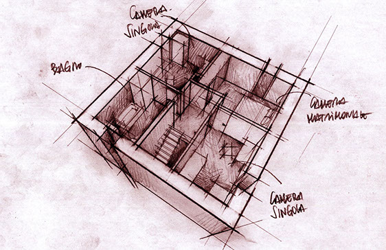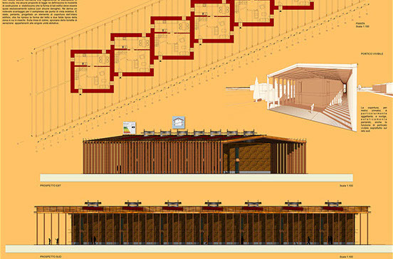 ABITARE LA TERRA CRUDA La proposta progettuale di questo edificio è nata con l’obiettivo principale dell’ecosostenibilità, attraverso l’introduzione di dispositivi bioclimatici attivi e passivi e l’uso di materiali sani . L'edificio di progetto è stato adattato, così, alle caratteristiche dell'ambiente circostante per ottenere il maggior vantaggio dal punto di vista termico e luminoso, sfruttando lo stesso "intorno" per migliorare le proprie condizioni di comfort. Dal controllo dell’impatto sole-aria sull’edificio, sono scaturiti, tenendo conto dei vincoli, l’orientamento, la forma, la distribuzione degli ambienti, e degli sporti dei tetti che riparano dai venti freddi e dalle piogge provenienti da nord, che potrebbero bagnare le pareti soprattutto in inverno. L’imponente copertura autoportante che avvolge l’edificio è stata progettata con lo scopo di proteggere l’intera struttura dagli agenti atmosferici, in quanto la terra cruda necessita della massima protezione da questi ultimi. Non si è potuto ricorrere ad un tipico tetto a due falde gravante sulla struttura stessa poiché la terra cruda non può sopportare carichi eccessivi. L’edificio è caratterizzato da murature di notevoli dimensioni (80 cm di spessore al piano inferiore e 65 cm al piano superiore); questi parametri possono sembrare eccessivi ma sono necessari per rendere la struttura in grado di sopportare i carichi. Un elemento a sfavore dell’edificio riguarda le aperture che si presentano piuttosto esigue. Questa scelta non è stata dettata da una intenzione estetica ma da un’esigenza strutturale. La questione delle aperture nelle case di terra cruda appare sempre come un punto critico. Tutti gli edifici già esistenti, costruiti con questo materiale, presentano finestre molto piccole in quanto la terra cruda è un materiale incoerente e la presenza di molte aperture provocherebbe l’indebolimento della struttura.